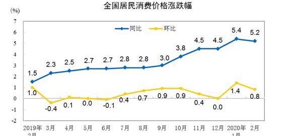 突如其來的新冠肺炎疫情對價格走勢形成了較為複雜的衝擊,2月份CPI同比上漲5.2%,漲幅較前月縮小0.2個百分點。
