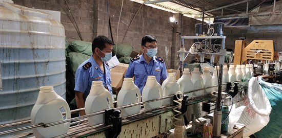 執法人員正在查看尚在工作中的洗衣液生產線。黃傳真攝