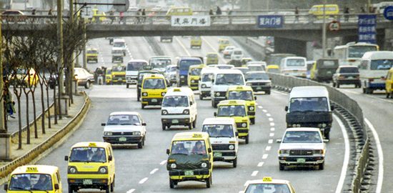 1993年12月,北京西二環復興門橋區行駛的黃色麵包出租車,市民稱之為“黃面的”。20世紀八九十年代,北京市機動車保有量不足百萬輛,私家車更是鳳毛麟角。北京市投放大量黃色微型麵包出租車投入運營,由於價格便宜(一元錢一公里),深受市民歡迎。