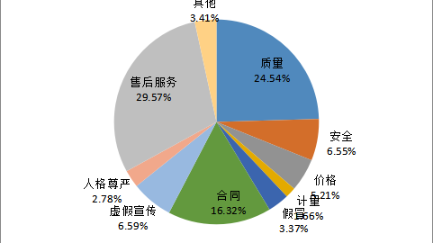 根據投訴性質分類,在所有投訴問題中,售後服務投訴69827件,佔總問題的29.57%;質量投訴57952件,占投訴總量的24.54%;合同投訴38542件,佔比16.32%;虛假宣傳投訴15557件,佔比6.59%;安全投訴15470件,佔比6.55%;價格投訴12311件,佔比5.21%;假冒投訴7949件,佔比3.37%;人格尊嚴投訴6560件,佔比2.78%;計量投訴3924件,佔比1.67%;其他投訴8050件,佔比3.41%。售後服務問題、產品質量問題和合同問題仍是引發投訴的主要原因,占投訴總量的70%以上。