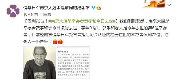 中新網12月18日電 據侵華日軍南京大屠殺遇難同胞紀念館官方微博消息,南京大屠殺倖存者賀孝和於今日凌晨去世,享年91歲。賀孝和老人是今年去世的第5位倖存者,目前經南京侵華日軍受害者援助協會認證的在冊在世的倖存者僅剩72位。