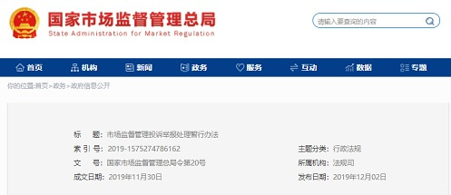 《市場監督管理投訴舉報處理暫行辦法》發布 2020年1月1日起施行