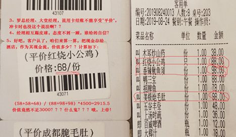 此外,殷先生在二樓就餐時要求上一份米飯,服務員表示沒有普通米飯,只有28元一份的泰國香米。無奈之下,殷先生只好點了泰國香米。隨後,他發現米飯不夠,要求服務員加一份米飯,誰料卻送來一份普通米飯。結賬時,前台人員說一樓有普通米飯,二樓沒有。
