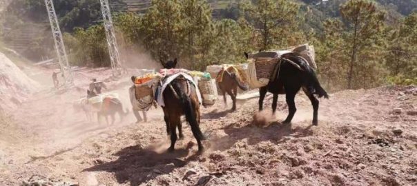 圖為騾馬隊馱運供電線材料。 丁琦 攝